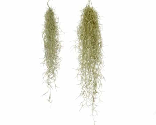 De Tillandsia Usneoides, ook bekend als Spaans mos, is een plant zonder wortels uit de epifytenfamilie. Deze plant haalt zijn water en voedingsstoffen via zijn bladeren uit de (vochtige) lucht en regendruppels. De Tillandsia Usneoides heeft krullende grijsachtige en lange naar beneden groeiende bladeren die meestal over de takken van bomen hangen. Het mooie van dit soort is dat het zichzelf en het leefgebied verspreidt door de hulp van Moeder Natuur. Voornamelijk door wind of vogels wordt deze luchtplant verplaatst en verspreid naar bijvoorbeeld andere takken en blijft zich dus ontwikkelen en groeien op andere plaatsen, wat heel anders is danonze andere luchtplanten.